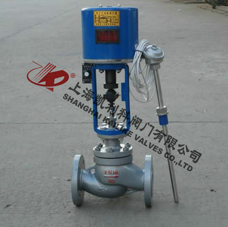 由單座調節閥、電動執行機構、溫度傳感器和溫度調節器等部件組成,根據用戶需要,分別有加熱型與冷卻型兩種結構。加熱型調節閥的結構與原理,工作前主閥芯處于半開位置,傳感器處于自然狀態。接上電源,主閥芯全開。介質由箭頭方向流入主閥體、經閥芯對儲熱箱進行加熱。當溫度升到相應設定值時,傳感器即產生相應線性信號輸入一體化執行機構,隨即驅動閥桿、閥芯產生位移,關閉主閥芯停止加熱。當溫度低于設定值時,傳感器即產生線性信號輸入一體化執行機構,驅使閥芯漸開,使介質按拋物線特性流入儲熱箱,進行加熱直至設定值。這樣被控介質始終在設定溫度范圍內被控制,從而達到控溫目的。